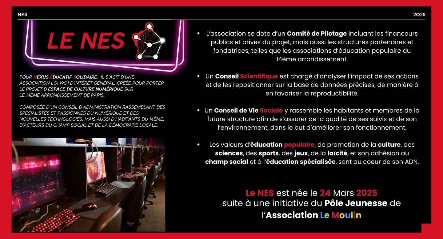 Le Nexus Educatif Solidaire est né d'un groupe de Geeks et de travailleurs sociaux révoltés face aux manques de moyens et d'actions pour aider les habitants des quartiers populaires à se saisir des nouvelles technologies.
